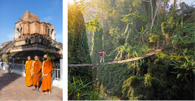 Die von den Resten einer antiken Stadt-mauer umgebene historische Altstadt, ist von über 200 buddhistischen Tempelanlagen geprägt. Das Wahrzeichen der Stadt, der Wat Phra That Doi Suthep Tempel, ist ein besonders beeindruckender Tempel auf einem Berg, von dem aus man eine atemberaubende Aussicht auf die Stadt hat. Der Wat Chedi Luang, im Zentrum der Stadt gelegen, ist ein weiterer wichtiger Tempel mit einer beeindruckenden Geschichte, der im 14. Jahrhundert erbaut wurde.