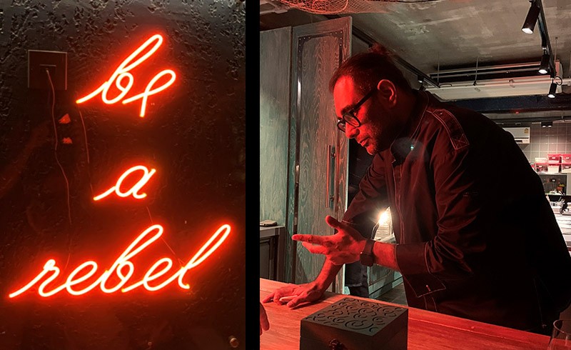 Gelernt hatte Anand unter anderem auch in Ferran Adriàs Molekular-Pilgerstätte „el bulli“, anschließend in verschiedenen Restaurants in Bangkok gearbeitet, bevor er 2010 sein erstes eigenes Restaurant (“Gaggan”) in der thailändischen Hauptstadt eröffnete. 2019 folgte nun der nächste Schritt, der Inder verwirklichte sich einen Traum und richtete sich ein neues Restaurant komplett nach seinen Wünschen ein – ein Streit mit seinen früheren Investoren erleichterte ihm die Entscheidung: “Köche sind kein Investment, keine günstigen Tagelöhner oder gar Küchensklaven, die für wenig Geld funktionieren müssen. Gegen diese kapitalistische Idee will ich hier rebellieren, deshalb hängt da hinten auch das Schild „Be a Rebel“ an der Wand. Chefs sind auch Menschen und Künstler, das wollen wir in diesem neuen Restaurant leben. Deshalb habe ich meine alten Partnerschaften hinter mir gelassen und alles was ich habe hier rein gesteckt. Jetzt hoffe ich nur, dass wir auch die Corona-Krise überstehen, mit einer Herausforderung dieser Art haben wir beim besten Willen nicht gerechnet.”