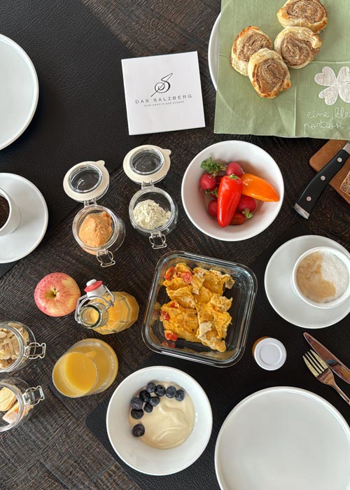 Als Willkommensgeschenk stehen bei der Anreise einige Salzberg-Specials im Apartment bereit: Eine kleine Auswahl an selbst gemachten Frühstücks-Schmankerln, je eine Flasche Rot- und Weißwein „Ried Salzberg“ aus der Weinregion Burgenland sowie eine Auswahl an Gourmetsalzen zum Kochen und mit nach Hause nehmen.