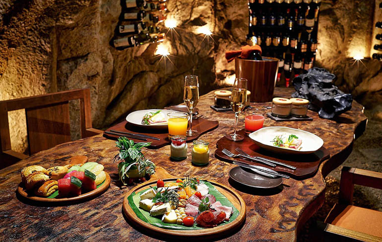 Bedingt durch die ganz besondere Lage des romantischen Resorts sind die „Privatvillen auf Zeit“ häufig auch Refugien für gekrönte Häupter und viele internationale Stars, die einfach nur abschalten und genießen wollen. Full-Service gibt es rund um die Uhr. Selbstredend besitzt jede der Villen einen eigenen privaten Pool, uneinsehbar und diskret. Allein oder zu zweit bewohnt, bieten die Villen genügend Freiräume, um sich auch einmal (selbst) aus dem Weg zu gehen. Die Boutique-Villen „verlieren“ sich um das Haupthaus mit den Restaurants und der obligatorischen Schoko-Bar. Als Krönung gibt es hier einen wahrlich in den Fels gehauenen Weinkeller mit exzellenten Kostbarkeiten. Er steht jedem Gast auch für Weinproben und gesellige Runden offen. Gelegentliche BBQs am Strand oder ein zwangloses Treffen in der Open-Air-Küche gestatten dem Urlauber Kontakte zu seinen Mitgästen. Das Restaurant Dining by the Bay bietet neben der wunderschönen Aussicht über die Bucht internationale und lokale Gerichte. Wer kulinarisch etwas mehr experimentieren möchte, kann sich mit Leckereien aus der „East meets West-Fusion-Küche“ verwöhnen lassen. Hervorzuheben wären je-doch die immer wieder überraschenden japanischen und vietnamesischen Küchenkreationen! Im Gourmetrestaurant Dining by the Rocks stehen Fisch- und Fleischgerichte auf der Speisekarte.