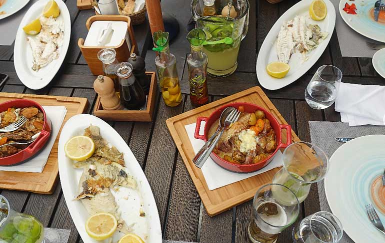 Die Geschichte wiederholt sich hier, denn fast täglich „entern“ Tausende Menschen aus aller Welt die Stadt, wenn sie, meist nur für ein paar Stunden, ihr Kreuzfahrschiff verlassen, um Bars, Souvenirläden und preiswerte Restaurants zu stürmen. Vorher (hoffentlich) gut informiert bestellt man statt Pizza als Vorspeise Priganice, ein kleines, köstliches Gebäck mit Honig oder Schafskäse. Als Hauptgang darf’s ein Teller Ukeleis (ein ca. 15 cm kleiner karpfenartiger Fisch) aus dem Skutarisee sein, „na gradele“, also vom Grill, eingerieben mit Rosmarin, serviert mit einer Marinade aus Knoblauch, Petersilie und Olivenöl, oder „nur“ einen Teller Fischsuppe, die Brodetto heißt. Schwergewichtig, aber unübertroffen eine Prsuta-Schinkenplatte, dazu eine Flasche roten Vranac-Wein, der, weil so dunkel im Glas, auch „Schwarzwein“ genannt wird. „Nachgespült“ wird mit dem Loza, einem Traubenschnaps, einem selbstgemachten Sherry, einem Walnusslikörchen.