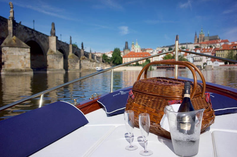 Dieses Hotel muss man zum Sightseeing eigentlich gar nicht verlassen, denke ich mir, und doch lockt mich ein besonderes Erlebnis aus den kuscheligen Federn. Im hoteleigenen Holzboot schippere ich frisch frühstücksgestärkt die Moldau entlang, unter der berühmten Brücke hindurch, die einst Krönungsweg der böhmischen Könige war und mit deren Bau im Jahre 1357 auf Geheiß von Karl IV., seinerzeit Herrscher des Heiligen Römischen Reiches, begonnen wurde. Immer wieder lasse ich meinen Blick auch auf die weiteren Prager Sehenswürdigkeiten schweifen und nur der Knall des Champagnerkorkens schreckt mich auf, erinnert mich plötzlich an den besonderen Anlass dieser Tour: Mit einem Gläschen stoße ich auf den 20. Geburtstag des Four Seasons Hotel Prag an.