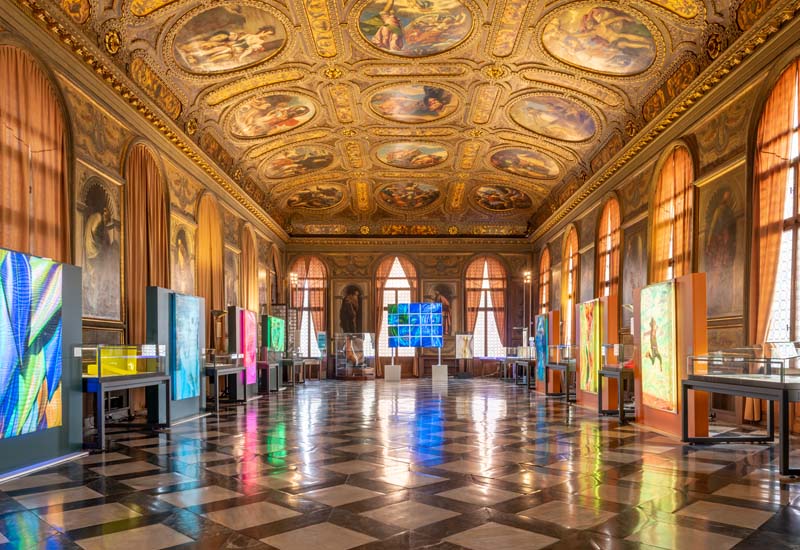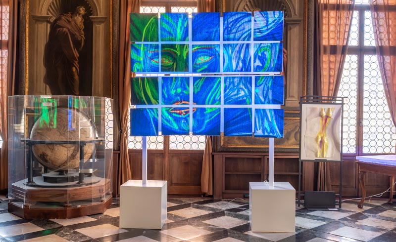 Eingebettet im historischen Rahmen der musealen Räume der Bibliothek und zwischen Galileos Globus, Marco Polos Weltkarte und Kunstwerken von Tintoretto und Tizian, erstrahlen selbstilluminierte Werke aus den patentierten und umweltverträglichen Werkstoffen des deutschen Künstlers und Erfinders Kilian Saueressig.