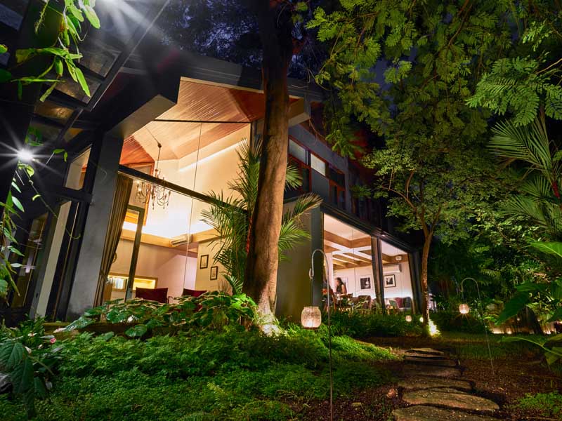 Unscheinbar in einem Wohngebiet gelegen, beeindruckt das mit zwei Michelin-Sternen ausgezeichnete Restaurant zunächst mit seiner Glasfassade, die einen großzügigen Blick in den paradiesischen Garten, auf Palmen, exotische Sträucher und bunte Blüten offenbart. Das Zirpen der Grillen sorgt für einen sanften Klangteppich, hier und da entdeckt man einen blauen Gecko und auch ein Affe hat sich hier schon durch die Bäume gehangelt. Drinnen dagegen erinnert alles an Deutschland: Fotografien Berliner Sehenswürdigkeiten zieren die Wände, Holzkommoden bieten Platz für fein angeordnete Trabant-Modelle, Schallplattenspieler und andere Erinnerungsstücke der Brüder.