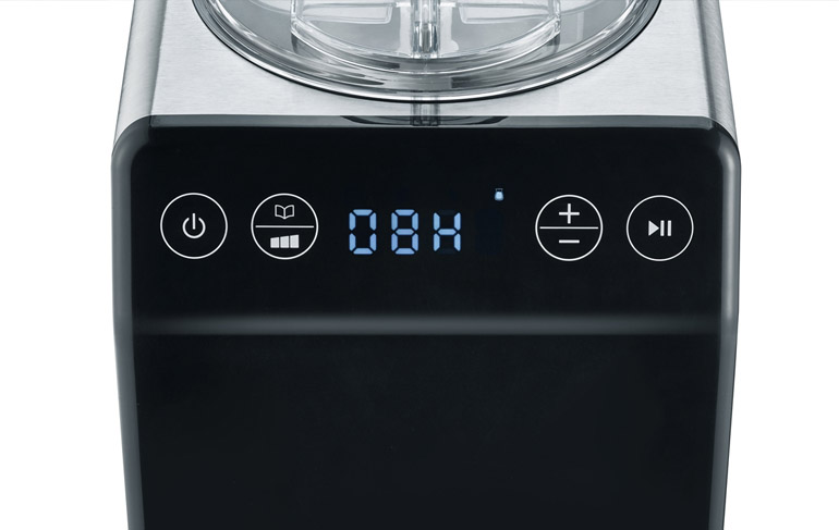 Gesteuert wird das Multitalent via Touchdisplay, über das per Fingertipp zwischen dem Eiscreme-, dem Rühr- und dem Kühlprogramm sowie den Zubereitungszeiten gewechselt werden kann. Die Statusanzeige verrät, welche Konsistenz das Eis gerade hat und wie lange es noch braucht. Neugierige können auch durch den durchsichtigen Deckel ihrer Kreation beim Werden zuschauen und mittels Nachfüllöffnung Zutaten ergänzen – praktisch, wenn die Eismaschine schon läuft. Ein kurzes Piepen verrät, dass das Eis fertig ist und mit dem mitgelieferten Eislöffel angerichtet werden kann.
