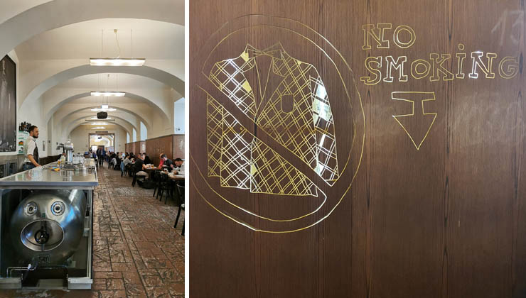 Lassen Sie uns mit dem Restaurant „Lokal“ starten; es ist sicher das größte, oder sagen wir besser das längste Restaurant Prags, denn es hat die Länge einer kompletten Straßenzeile. An endlos langen Tischen sitzt ein buntgemischtes Publikum und genießt preiswerte und typisch tschechische Speisen. Unkompliziert, schmackhaft, für jedermann erschwinglich – ohne unnötigen Schnickschnack, ohne Wenn und Aber. Panierter Käse, Prager Kochschinken mit Meerrettich, eine flotte Würstchenauswahl, eingelegter Hering, traditioneller Kartoffelsalat und dazu immer dieses unvergleichlich frische, vollmundige Bier. Täglich aus Pilsen frisch angeliefert fließt es direkt aus großem Tank unter der Theke ins Glas. Und dann die oft gestellte Frage: Ist dieses traumhafte Bier wirklich billiger als Wasser? – Zumindest zählt Bier in Tschechien zu den Grundnahrungsmitteln und wird genau wie diese besteuert. Das Interieur des „Lokal“ erinnert die Älteren unter uns irgendwie noch an die Zeiten des sozialistischen Einheitsbreis, hat für die Jüngeren aber einen ganz eigenen Charme – doch spätestens nach dem ersten Bier sind wir uns einig: Die an eilig hingekritzelte Wandverunstaltungen erinnernden Bilder auf der Wandverkleidung zeigen den Humor und die Ironie; den Witz und die Freude der Betreiber dieser gastlichen Stätte.