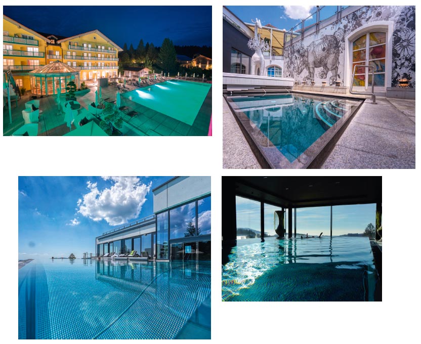 Der Angerhof ist eine der angesagtesten Wellness-Adressen, und das auch, weil der 20 m lange Sky-Infinity-Pool einen unglaublichen Fernblick über das Donautal bis hin zu den Alpen möglich macht und so ein Fernweh gar nicht aufkommen mag. Denn kaum zu glauben: mit dem richtigen Blickwinkel entsteht der Eindruck nicht im Bayerischen Wald, sondern direkt irgendwo in der Südsee oder in der Karibik dem wundervollen Sonnenuntergang entgegenzuschwimmen; das Wasser ist bis zu 32°C warm, und nun ja, die Tagestemperaturen mit 38°C plus sind auch erreichbar. Warum also in die Ferne schweifen…