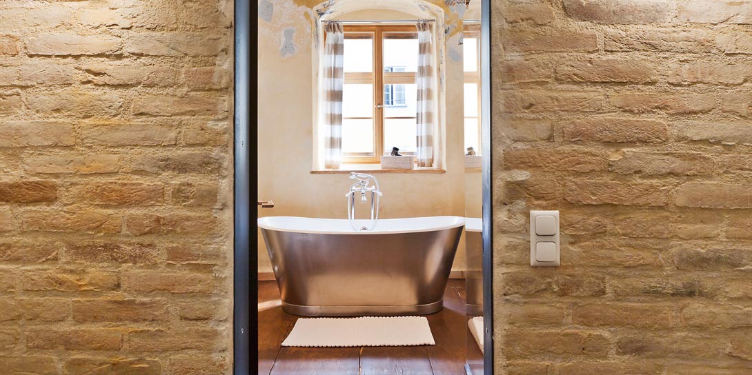 Das denkmalgeschützte Boutique-Hotel David liegt in einer ehemaligen romanischen Doppelkapelle mit Wohnhaus für Mönche aus dem 12. Jahrhundert. Wandschichten aus verschiedenen Epochen wurden großzügig freigelegt und konserviert. Im Obergeschoss etwa überziehen gemalte Rosenranken den Putz. Fußböden aus dem Barock sind im Original erhalten. Dazu gehören zeitgenössische Fliesen, die aus belgischen Kirchen stammen, Waschbecken aus massivem Blaustein und nach historischem Vorbild gefertigte Türbeschläge. Alle Zimmer sind Unikate mit hochwertigem, modernen Mobiliar, frei stehenden Badewannen (siehe Titelbild), italienischen Duschen und pointiert gesetzten Designelementen aus der Geschichte des Hauses: Wandmalereien aus dem Biedermeier, freigelegte Renaissance-Blumenmotive, sichtbares antikes Mauerwerk und Gebälk.