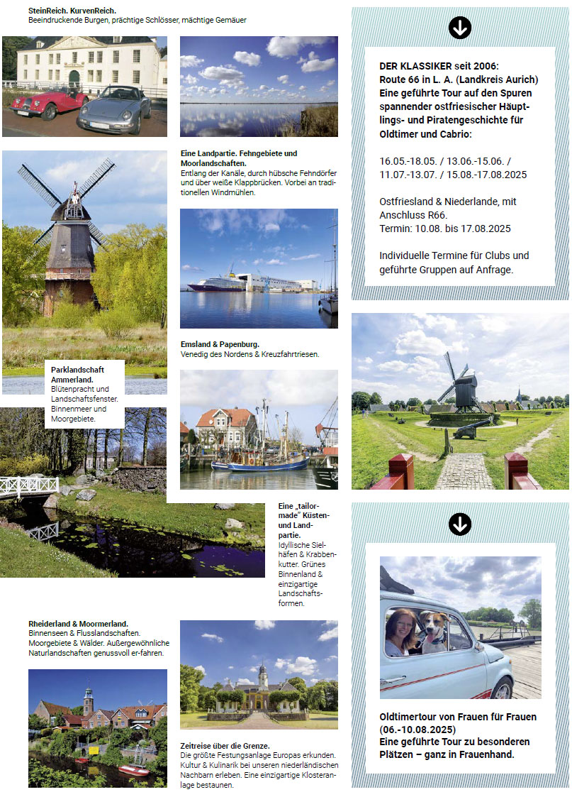 Ausgangspunkt für Ausfahrten mit Oldtimer, Cabrio und Sportwagen auf verschlungenen Routen. Mit Tourenbüchern in Eigenregie auf faszinierenden Zeitreisen und Themen-Touren den Zauber einer wunderbaren Landschaft entdecken und erlebnisreiche Tage im Nordseeklima verbringen. Es gibt eine Vielfalt an Möglichkeiten!