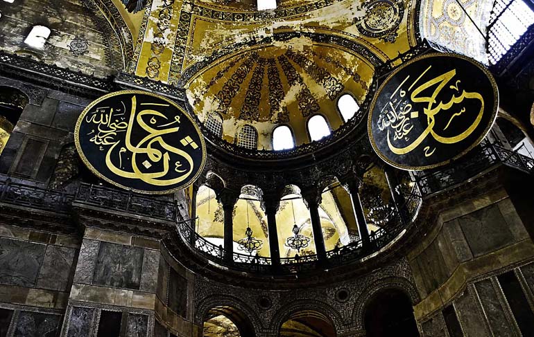 Ein erster Spaziergang durch die Altstadt führt zum Sultan-Ahmet-Platz (türkisch: Sultanahmet Meydanı), der einst als Hauptstraße Konstantinopels diente. Viele der beliebtesten Sehenswürdigkeiten Istanbuls säumen den Platz – vor allem die Hagia Sophia. Die ehemals griechisch-orthodoxe Kirche wurde im 14. Jahrhundert in eine osmanische Moschee umgewandelt. Heute ist das massive, reich verzierte Bauwerk säkularisiert und dient als Museum. Im Inneren säumen prächtige Mosaike die Wände der Galerie, ebenso wie kalligraphische Scheiben und andere Meisterwerke.