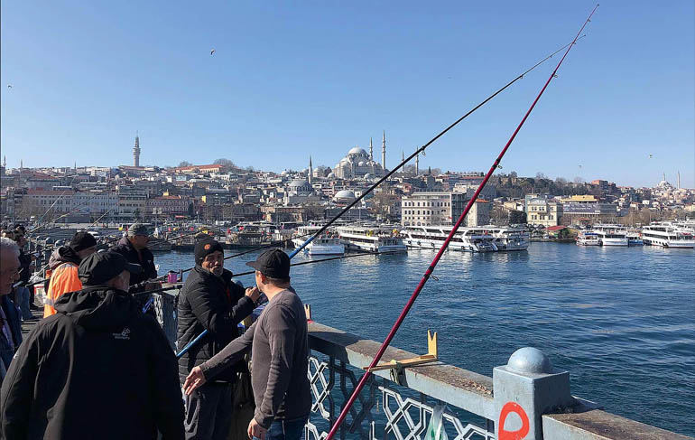 Einen Überblick über dieses quirlige Geschehen hat, wer mit etwas Glück einen Fensterplatz im mehrstöckigen Restaurant Hamdi in Eminönü „ergattert“. Ein kleiner Aufzug führt zur (verglasten) Dachterrasse. Mit einem herrlichen Blick auf das lebhafte Leben direkt unten am Pier, der weltbekannten Galatbrücke über das „Goldene Horn“, genießt man die typische unverfälschte türkische Küche.
