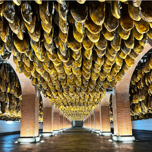 Ortstermin im Dörfchen Jabugo, seit jeher Epizentrum der spanischen Edelschinkenproduktion: Mitten in einem UNESCO Biosphären-Reservat und umgeben von den hier typischen Dehesas (Eichenhaine mit natürlicher Weidefläche) kommen Charcuterie-Aficionados voll auf ihre Kosten. Kein Wunder, denn man kann sich an den tausenden, im seichten andalusischen Wind baumelnden Schinken kaum sattsehen. Der beeindruckende Anblick in der Bodega Cinco Jotas in der Provinz Huelva ist das Resultat eines von der Aufzucht bis zum Produkt fünf Jahre andauernden und streng reglementierten Prozesses.