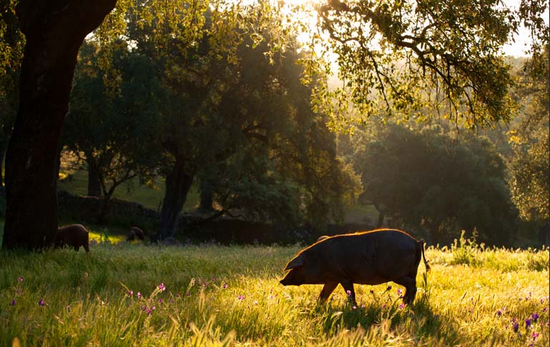 Frei und inmitten von Korkeichenwäldern lebende Iberische Schweine, dazu jede Menge Eicheln, viel Handarbeit, Salz und ausreichend Reifezeit im wispernden Wind Andalusiens gehören zum unschlagbaren Erfolgsrezept von Cinco Jotas. Schon seit 135 Jahren dreht sich bei Spaniens bekanntester Schinken-Marke alles um den Jamón Ibérico de Bellota.