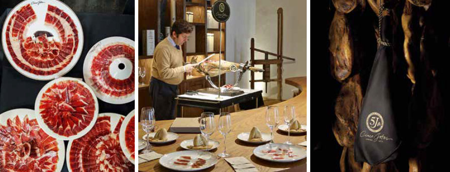 Nach dem ausgiebigen Eichel-Schmaus im Herbst und der winterlichen Schlachtung im Alter von zwei Jahren werden die Schinken zunächst in Form gebracht und die äußere Fettschicht sorgsam entfernt. Im Anschluss werden die Keulen für gut ein bis zwei Wochen in Meersalz eingelegt und danach etwa zehn Monate in den nun allmählich wärmer werdenden Jahreszeiten luftgetrocknet, um sie haltbar zu machen. Dabei verliert der Jamón Ibérico bis zu 45 Prozent Gewicht, bevor er zum dreijährigen Reifen in einen der zahlreichen Keller der Bodega kommt.