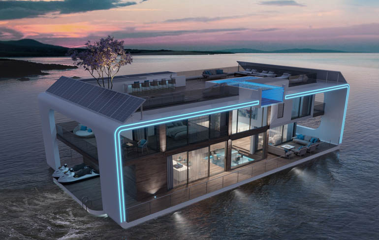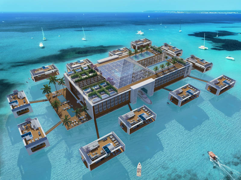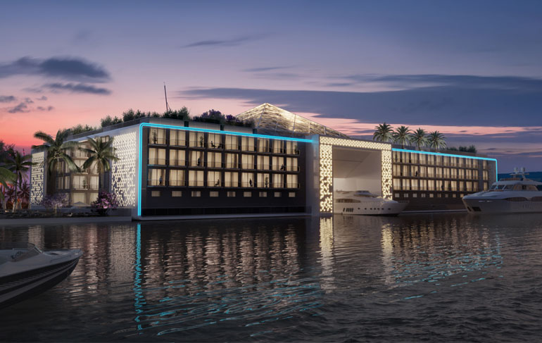 Das in vier Teile strukturierte Hauptgebäude wird in der Mitte durch eine Glas-Pyramide verbunden und bietet von exklusiven Gourmet-Restaurants, Bars, Spa, Pools, Boutiquen und Bankettbereichen jeglichen Luxus eines 5-Sterne Hotels. In der Mitte des Hotels können sogar grössere Yachten ein- und ausfahren und die Gäste gebührend ankommen lassen. Die 12 mit Stegen verbundenen Luxusvillen sind teilweise zum Verkauf, aber auch als Mietobjekte für Hotelgäste vorgesehen und profitieren von sämtlichen Services, die im Hotel angeboten werden. Hochwertiges und elegantes Design auf zwei Etagen mit Dachterrasse und Infinity Pool, zur Auswahl mit zwei, drei oder vier Schlafzimmern, Crew und Angestellten Zimmer sowie Indoor- und Outdoor Wohnzimmer zeichnen die Luxus-Hausboote mit grossen Panoramafenstern und allen technischen Angeboten eines Smart Homes aus. Die bei einer Maximalgeschwindigkeit von 6 Seemeilen fahrenden Villen verfügen über Solarzellen und sind umweltfreundlich konzipiert.