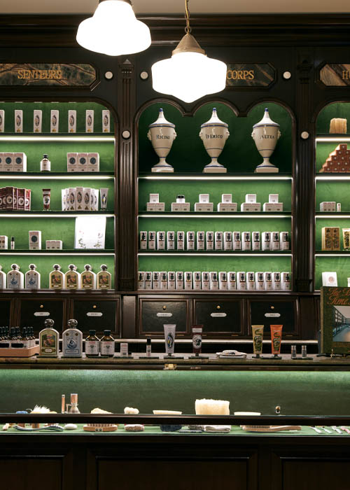 Namen verschiedener Ingredienzien weisen auf die Pflegeprodukte in den Schubladen und Vitrinen hin. In mit Samt ausgeschlagenen Rundbögen liegen die Schätze der Officine Universelle Buly: Eaux Triples, feine Pflege-Duftöle für den Körper, ikonische Duftkerzen in ihren Marmorbehältnissen mit Glasglocke, besondere Zahnpflege und Pomaden, Puder und exklusive Gesichtspflege. Dazu eine Reihe erlesener Beauty Tools wie zum Beispiel Kämme und Bürsten aus der ganzen Welt.