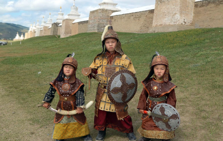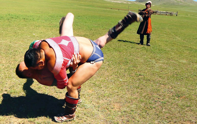 Damit die Jungs und die Männer so richtig Dampf ablassen können, gehören Pferderennen, eingeteilt in verschiedene Klassen, zu den sportlichen Herausforderungen. Der Jahreshöhepunkt ist ein 30 km Rennen, etwas außerhalb der Hauptstadt. Jungs und neuerdings auch Mädchen, alle so ab 5 Jahren, reiten für Ruhm und Ehre ihrer Familien und haben Chancen, auch noch später in die Geschichtserzählungen mit eingebunden zu werden. Das Nationalfest „Eriin Gurwan Naadam“ – Drei Spiele der Männer – ausgetragen im größten Stadion des Landes in Ulaanbaatar, findet alljährlich vom 10. bis 13. Juli statt und ist für die Mongolen das, was für uns die olympischen Spiele sind – nur kleiner, ursprünglicher. Die Sportarten sind Pferderennen, Bogenschießen und Ringen. Beim Bogenschießen gilt es beim Naadam, im krassen Gegensatz zu unseren runden Schießscheiben, 20 Pfeile auf eine vier Meter lange und 48 cm hohe Wand aus gestapelten Körben zu treffen. Die Männer schießen aus 75 m, die Frauen aus 60 m Entfernung. Treffer werde durch lautes Singen von traditionellen Melodien (uukhai) von den Kampfrichtern angezeigt.