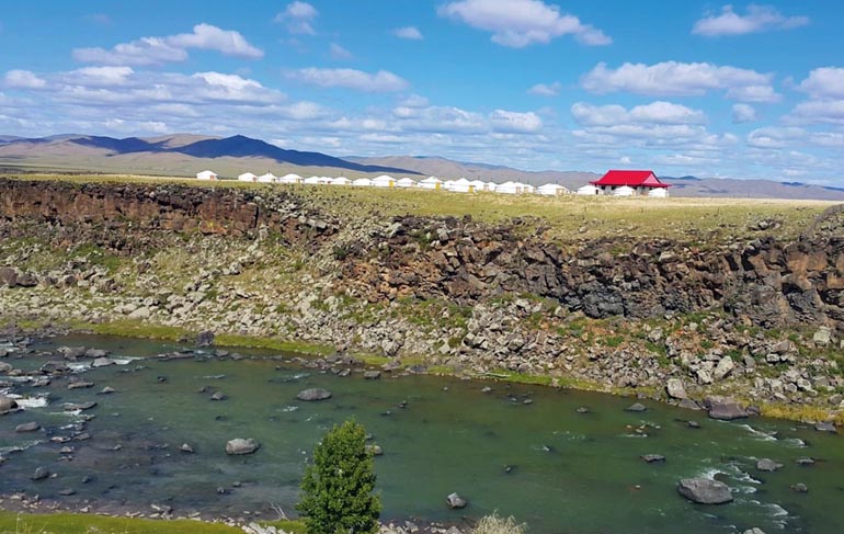 Allgegenwärtig sieht man Nomaden, die ihren Standort ändern. Mit ihnen wechselt man Ziegen-, Kuh- und Stutenmilch, Käse und Fleisch in bare Münze oder Gegenstände, die man aus der fernen Stadt mitgebracht hat. Der Kontakt bietet sich besonders auch für Gäste an, um die Kultur und das normale Leben eines umherreisenden Nomadenvolkes mit ihren Pferde-, Yak-, Schaf- und Ziegenherden näher kennenzulernen. „Mittendrin – am Ende der Welt“ liegt die Talbiun Lodge so zentral, dass alle kulturellen Stätten des Landes in Tagestouren erreicht und besichtigt werden können. Von hier aus ist es nicht weit, um das Orkhontal, zwischen Khujirt und dem 20 Kilometer entfernten Wasserfall zu erkunden. Auch gleich „in der Nähe“ befinden sich die heißen Quellen von Tsenkher. Mit über 50 °C sprudelt schwefelhaltiges Wasser aus der Erde, das in zwei gepflegte, von Natursteinen eingefassten Becken geleitet wird. Führt der Fluss viel Wasser, verdoppeln sich die jeweiligen Strecken, denn die Furt ist nicht mehr überquerbar. Das gilt auch für die Fahrt zum Kloster Tövkhönii am nordöstlichen Ende eines Seitentals des gleichnamigen Flusses.