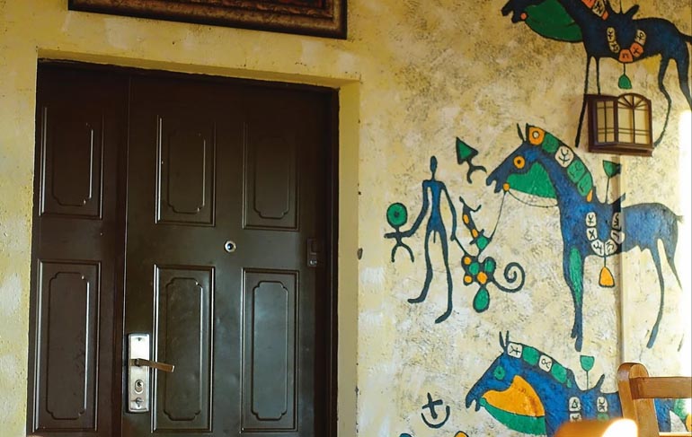 Mit dem Geländewagen sind es „nur“ zweieinhalb Stunden „geschütteltes“ Fahren. Nicht weit entfernt, „nur“ 80 Kilometer, liegt die einstige Hauptstadt Kharakhorum von Dschingis Khaan. Sterne für die Unterkunft zu vergeben, wie bei einer Hotelklassifizierung, erübrigt sich. Alle Jurten sind mit Doppelbetten oder zwei Einzelbetten ausgestattet und gewähren so die Privatsphäre der Gäste aus aller Welt. Maximal 100 Gäste können in den „Ger’s“ untergebracht werden, als Single-, Double-, Dreier- oder Viererbelegung (z.B. Familien). Zum großen Luxus dieses „Resorts“ zählen die zahlreichen Duschen – eine einzige Wohltat. Und Toiletten mit Wasserspülung. Die Wände im Haupthaus, der Meeting-Point, sind reichlich bemalt von mongolischen Künstlern. Unübersehbar ist das große Wandbild des namhaften Künstlers Ts. Tsegmid. Es wiederholt unter anderem die Motive aus alten Felszeichnungen, die teils noch aus der Steinzeit stammen. Statt in Museen, findet man die Steine in den gebirgigen Gegenden der Mongolei „einfach so“.