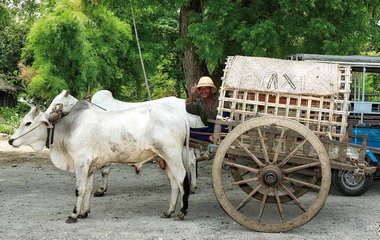 Auf engen und gut ausgebauten Straßen fährt man etwa 90 Minuten von Heho nach Pindaya, der Spinnenstadt. Ab und zu muss ein Stopp eingelegt werden, wenn weiße Buckelrinder, Hunde und gefiederte Tiere die Straße queren oder neugierig schauend stehen bleiben. Interessant zu sehen, wie mit uralt und exotisch anmutenden Gerätschaften die kupferrot gefärbten Böden bearbeitet werden. Für die Bauern ist es Schwerstarbeit mit dem 1-Zylindertraktor, den man hier spöttisch „chinesisches Pferd“ nennt, den fruchtbaren Boden zu beackern. Die Frauen, wenn sie nicht gerade Opfergaben spenden, waschen im Kollektiv ihre Kleider direkt im braunen Wasser des Sees, während ein paar Meter weiter Kühe grasen, verdauen und Kinder nebenan nackt herum tollen und ihre Kindlichkeit in vollen Zügen genießen. In der hügeligen Umgebung liegen Tee- und Kaffeeplantagen, Felder mit Mais, Knoblauch, Zwiebeln, Zuckerrohr, Erdnüssen, Reis und vielem mehr. Ab und zu trifft man Intha’s an, Einheimische, die in (für uns) idyllischen Bergdörfern leben, Frauen die auf ihren Rücken schwere Säcke mit Lebensmitteln zum nächstgelegenen Markt schleppen.