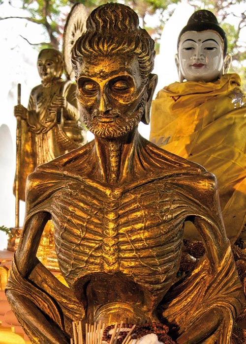 Neben dem „Goldenen Felsen“ und der Shwedagon Pagode zählt die Mahamuni Pagode zu den Hauptpilgerzielen in Myanmar. Sie ist das religiöse Zentrum der Stadt. Hunderte von Glöckchen hängen an ihrer goldenen Dachspitze. Die Besucher ziehen Schuhe und Strümpfe am Eingang der Pagode aus (gilt für alle religiösen Bauten) und nähern sich barfüßig auf Marmorfliesen der riesigen, vier Meter hohen, im Lotussitz (auch Padmasana oder Vajirasana) sitzenden Buddha Statue, die als Abbild des Buddha verehrt wird. Der Legende nach wurde sie im 1. Jahrhundert gegossen und ist die mit Abstand meistverehrte Figur des Landes. Eine bis zu 15 Zentimeter dicke Goldschicht wurde über die Jahrhunderte aufgetragen und ist nun bis zu Unkenntlichkeit beklebt. Nur Männer dürfen sich ihr nähern und sie berühren.