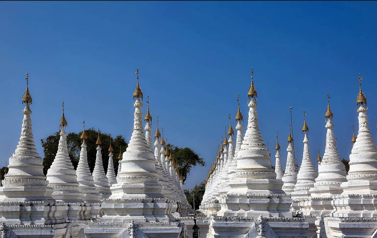 Bevor es ab 18 Uhr dunkel wird in Mandalay, tauchen exakt 729 weiß getünchte, in ordentlichen Reihen angeordnete kleine Stupas (pavillonartige Tempel) ihre vergoldeten zierlichen Spitzen glänzend in den tiefblauen Himmel. In ihrer Mitte, die zentrale Stupa, die erst etwa über 200 Jahre alte Kuthodaw Pagode, die auch als „größtes Buch der Welt“ bezeichnet wird. In den umliegend kleineren Schreinen befinden sich Marmortafeln, auf denen die vollständigen buddhistischen Tipitaka (Palikanon – die älteste zusammenhängende und überlieferte Sammlung von Lehrreden des Buddha Siddhartha Gautama) geschrieben sind. An der Erstellung der Marmorinschriften waren (1860-1868) mehr als 200 Steinmetze beteiligt. 2.400 Mönche, die König Mindon anlässlich des Buddhistischen Weltkongresses im Jahr 1871 damit beauftragte, die Inschriften zu lesen, waren damit mehr als sechs Monate beschäftigt.