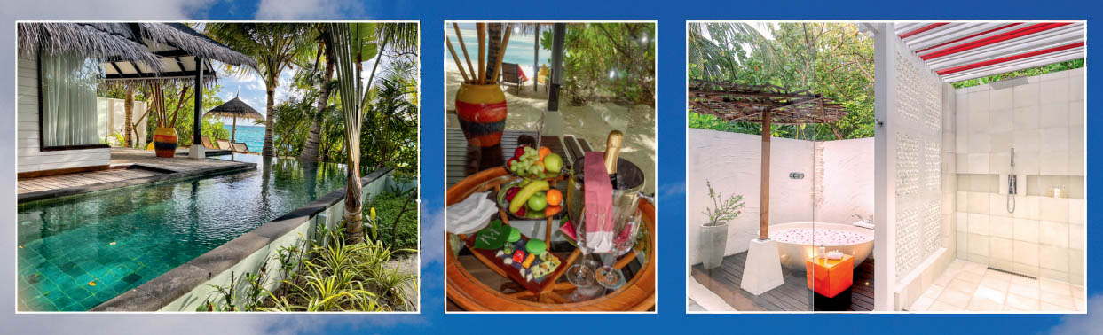 Per Bicycle (Fahrservice gibt’s auch) und im Schatten tropischer Gewächse radle ich drauf los und über einen Steg erreiche ich das Hauptrestaurant „The Palms“. Champagner zum Frühstück? Ich gönne mir, nein „teste“ das Konzept INDULGENCE™ Plan. Damit gibt es keine überraschende Nebenkosten, denn sowohl die Gourmet-Verpflegung sowie handverlesene Champagner, weltbekannte Gin Sorten, feinste Whiskeyauswahl, renommierte Weine und leckere Cocktails gehören zum Angebot. Und tatsächlich, bei der Endabrechnung finde ich keinen derartigen Posten auf der Abschlussrechnung. Dafür habe ich im OZEN-Shop „zugeschlagen“, eben all das, was man für einen Malediven-Urlaub braucht (oder zuhause vergessen hat).