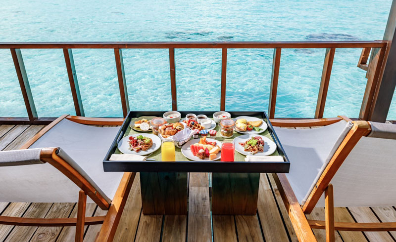 Bewundernswert ist schon am frühen Morgen, was die fleißigen Mitarbeiter für das Buffet zusammengetragen haben. Mit Stäbchen, Löffel oder Messer und Gabel: indisch, arabisch, lokale Köstlichkeiten und „westlich“, mit Muffins, Bagels, vegan, Würstchen, Spiegeleier (!) – es ist alles da und davon reichlich. Die Auswahl an frisch gepressten Getränken, die süßen Sachen – man muss schon einen guten Appetit haben, um ein bis zwei Stunden später hier oder im LONU mit traditionellen maledivischen Spezialitäten mit lokalen Zutaten zum Lunch wieder „aufnahmebereit“ zu sein. Am Abend ja – aber es gibt dann noch das Traditions IndoCeylon mit der traditionellen Küche aus Indien, Sri Lanka und den Malediven, alternativ das Tradition Peking mit Spezialitäten aus dem fernen Osten.