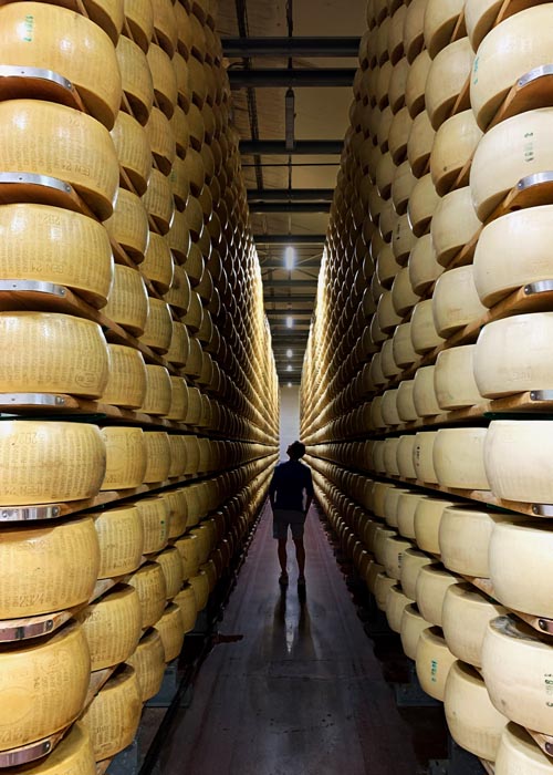 Um 6 Uhr machen wir uns dann an die Arbeit: In riesigen Kupferbottichen werden die täglichen 7.000 Liter Milch der 250 Kühe erhitzt und alles in Handarbeit zu Parmigiano Reggiano verarbeitet. Über den Tag entstehen hier bei Hombre gerade mal 14 Parmesanräder, die jedoch nicht gleich verzehrt werden können. Zunächst heißt es abwarten, denn nun kommt die teuerste Zutat, die Zeit, ins Spiel. Für den Käse geht es in die heiligen Hallen, die einen millionenschweren Schatz bergen: Hinter großen Scheunentoren lagern bei perfektem Klima tausende von Parmigiano-Laiben, die regelmäßig gewendet, mit Salzlake eingerieben und – inzwischen maschinell – gebürstet werden.