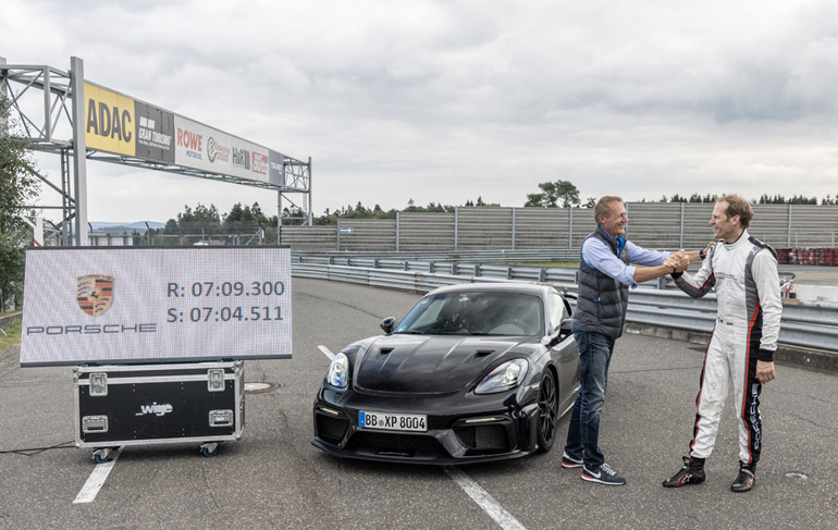 Markenbotschafter und Entwicklungsfahrer Jörg Bergmeister umrundete die 20,832 Kilometer lange Nürburgring-Nordschleife mit einem leicht getarnten Serienfahrzeug in 7:09,300 Minuten. Die kürzere, früher als Vergleichsmaßstab dienende Variante mit 20,6 Kilometer Länge absolvierte der GT4 RS in 7:04,511 Minuten – exakt 23,6 Sekunden schneller als der kleine Bruder 718 Cayman GT4. Zum Schutz des Fahrers war der Mittelmotor-Sportwagen mit einem Rennsitz ausgerüstet. Montiert waren optional erhältliche Reifen des Typs Michelin Pilot Sport Cup 2 R. Ein Notar bestätigte den Serienzustand und das Seriengewicht des Fahrzeugs.