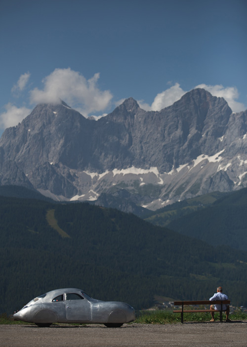 „Nachdem ich mich spontan entschlossen hatte, zur Ennstal Classic in die Steiermark zum Fotografieren zu fahren, kontaktiere ich einige Bekannte dort in der Nähe – natürlich genauso PS-verrückt wie ich selbst. Darunter Michael Barbach, Porsche-Spezialist aus Niederösterreich, der mir sofort anbietet, seinen spektakulären, selbst aufgebauten Berlin-Rom Wagen für ein paar Fotos mit nach Gröbming bringen.