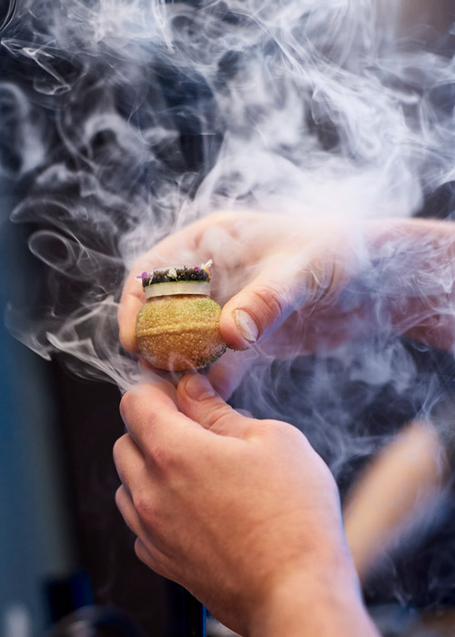 Das Alchemist ist aber nicht nur wegen des Dome – dem eigentlichen Speisesaal mit überdimensionaler Projektionskuppel (18 Meter Durchmesser) – das derzeit wohl beeindruckendste Restaurant Europas, wenn nicht weltweit, sondern auch wegen seiner Küche. Die Gerichte des enorm experimentierfreudigen Munk sind kühn, meist mit provokativer Botschaft und obendrein mit allerlei technischen Gerätschaften zubereitet. Inspiriert von der Molekularküche – Munk greift gerne auf Schockfroster und Rotationsverdampfer zurück – setzt der Spitzenkoch bei der Umsetzung fast ausschließlich auf nordische Produkte. Doch mehr noch als das, erfahren wir schon bei den Amuse Bouche gleich zu Beginn des Abends, mit welchem Eifer sich das Team hier der Wissenschaft widmet. Produkte und neue Techniken werden im Hinblick auf eine nachhaltigere Nahrungsmittelproduktion und deren gerechtere Verteilung erforscht – Munk und sein Geschäftspartner Lars Seier Christensen versorgen mit ihrer Organisation „Junkfood“ zudem 300 Obdachlose – Tendenz steigend – täglich mit warmen Mahlzeiten.