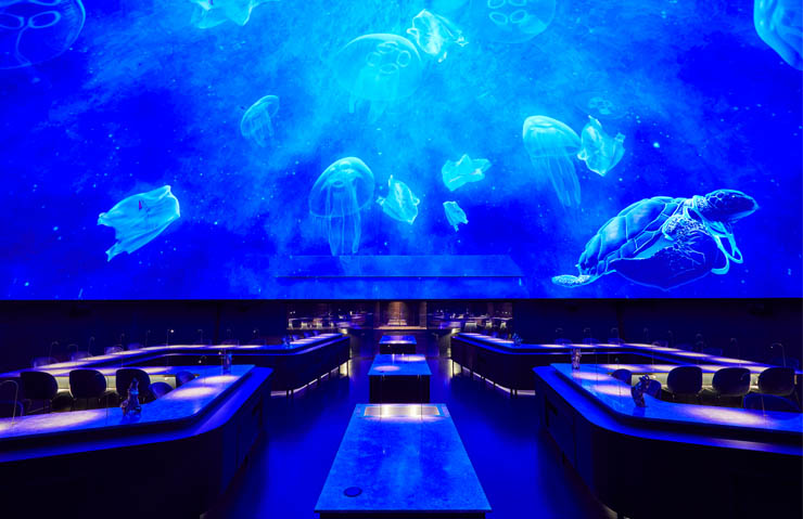 Passend zu diesem roten Faden ändern sich auch die Projektionen auf der riesigen Kuppelleinwand im Dome immer wieder. Zehn Laserprojektoren sorgen für eine eindringliche optische Untermalung der Gerichte. So wird Munks jeweilige Botschaft nochmals verstärkt, wenn einen plötzlich zigtausende Augen beim Essen beobachten, Quallen inmitten von durchsichtigen Plastiktüten umherschwimmen und man beim Dessert in einem pochenden Herzen sitzt. Kein Wunder, dass sich schon mehr als 1.500 Gäste im Alchemist über den QR-Code auf dem Teller als Blutspender registriert haben.
