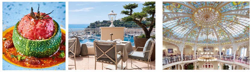 Zugegeben, auf den ersten Etappen dieser Reise kommen wir nicht weit und stoppen auch im dritten Schritt schon nach wenigen weiteren Kilometern im eben noch von der Panoramaterrasse des Ceto betrachteten Monaco – genauer gesagt im dort gelegenen Hotel Hermitage. Neben einer von Gustave Eiffel gestalteten Lobby sowie Zimmern und Suiten, die in einer eigenen Liga spielen, hat es mit dem Restaurant Pavyllon (1 Michelin-Stern) natürlich auch kulinarische Extraklasse zu bieten. Mit dem beeindruckenden Ausblick über den Yachthafen und erlesenen Gerichten aus der Feder des renommierten Kochs Yannick Alléno, der eine moderne Version der französischen Küche mit Hang zu den hiesigen Produkten serviert, erlebt man hier das berühmte Savoir-vivre, das den französischen Lebensstil so auszeichnet.