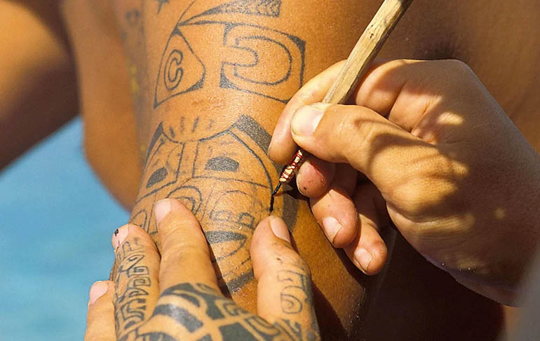 Beeindruckend zu sehen, wie in traditionellen „Sitzungen“ Tattoos gestochen werden. Stundenlang treibt Petole Suluape, der Tätowiermeister tausendfach die scharfen, in Tinte getunkten Zinken, mit einem kleinen Holzschlegel in die Innenseiten des Oberschenkel des Mannes, der vor ihm liegt, umrahmt von Freunden oder aber auch, um ihn vor den neugierigen Blicken der Handvoll Touristen drum herum zu schützen. Tätowiert zu sein, gehört zum Lebensstil der Insulaner und folgt einer jahrtausendealten Tradition, die von den Knien bis zum Bauchnabel reicht und flächig pigmentiert wird. Zur Prozedur gehört ein Ritual: tagelang keine Rasur, kein Parfüm, kein Sex, und geschlafen wird auf dem harten Boden. Am Ende werden so die bösen Geister mit Ölbädern davongejagt.
