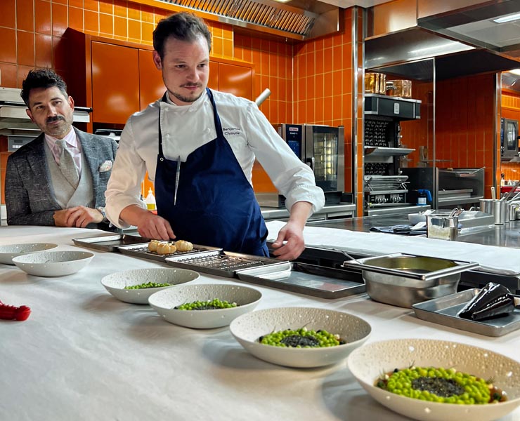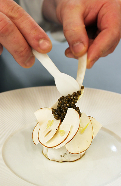 Dass Kaviar aber nicht gleich Kaviar ist und die vielfältigen Varianten wie Imperial oder Sevruga nicht nur geschmackliche Unterschiede offenbaren, weiß selbstverständlich auch Benjamin Chmura (0ben im Bild), Küchenchef des traditionsreichen Restaurant Tantris (2 Michelin Sterne). So unterscheiden sich auch die meistverbreiteten und anthrazit colorierten Sorten, der cremigere Beluga und der vom russischen Stör stammende Osietra Kaviar, in weiteren Aspekten. Sowohl die Größe ihrer Körnung als auch die Härte ihrer Schale und damit der Biss sind verschieden. Chmura schwört auf letzteren, verfeinert entweder einzelne Gerichte damit oder serviert den würzigen Fischrogen als Protagonisten in seinen Menüs: „Der Osietra überzeugt vor allem aufgrund seiner nussigen Note und eignet sich auch für Kaviar-Neulinge gut. In Kombination mit Champignon, Haselnuss und Meeräsche ist es aktuell unser erster Gang im Menü und auch beim Dîner au Passe, unserem neuen Chef´s Table in der Küche des Tantris, bereiten wir diesen Gang â la minute vor den Augen unserer Gästen zu.“