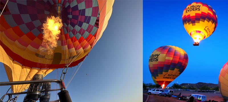 Noch faszinierender ist eine Heißluftballonfahrt bei Sonnenaufgang. Besonders dann, wenn frühmorgens wie aus dem Nichts an die 30 Ballone mit durchschnittlich 4.000 m³ von Hot Air Expeditions so ganz allmählich durch die warm zugeführte Heißluft aufbläht werden und dann still und leise dem Sonnenaufgang entgegenfahren (nicht fliegen). Hoch über die Köpfe derer hinweg, die bei Querfeldeinexpeditionen im Jeep, Ausritten, Segway-Exkursionen oder Kajaktouren auf dem Salt River die Region erkunden, auf dem Weg zum Grand Canyon oder nach Sedona sind. Selbst für von Höhenangst geplagte Menschen ein unvergessliches Erlebnis, weil der Fahrer weiß, wie man von aufkommender Übelkeit ablenken kann …