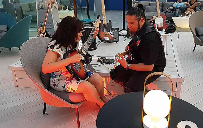 Wie in allen Hard Rock Cafes rund um den Erdball, nimmt sie auch das Hard Rock Hotel Teneriffa mit auf eine nostalgische Reise durch die Rock- und Popgeschichte. Original Musikinstrumente, Bühnenoutfits, Schallplatten, Manuskripte sind ausgestellt und dokumentieren das Leben der angesagtesten Musiker aller Zeiten. Musik begleitet sie durch ihren ganzen Urlaub. Aber keine Angst vor immer gleicher zu lauter Beschallung. Ein extra Sound Experience Manager ist den ganzen Tag im Resort unterwegs, um Musik und Lautstärke individuell an Situationen, Restaurants und natürlich die Gäste anzupassen. Beim Frühstück auf der Terrasse ein erstes Gitarrensolo von Gabo Siverio, der dann auch auf einem Podest mitten im Lagoon Pool mit dem DJ jammt und für perfektes Beachfeeling sorgt.