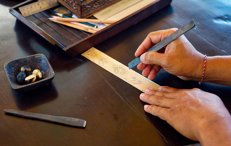 Ketuk, der stets freundlich lächelnde Balinese ist ein festangestellter Mitarbeiter im Hotel und gibt regelmäßig Kurse. Er lehrt den Resortgästen die „Handschrift der Götter“ zu erlernen. Die Kunst Lontar zu beschriften erlernt man nicht in ein paar Stunden! Sie gleicht dem Versuch, ein in antiker Sprache handschriftlich geschriebenes Exemplar einer Bibel abzuschreiben und deren Bilder abzuzeichnen. Grundlage ist die Faser des Rontalbaums, der aber eine Palme ist, ähnlich der Papierherstellung. Doch nicht mit Pinsel und Tinte, sondern mit einem scharfen Messer werden Texte und Zeichnungen beidseitig in die harten „Blätter“ eingraviert. Anschließend wird die „Gravur“, also der Text, mit schwarzer Tinte oder der Macadamianuss eingefärbt.