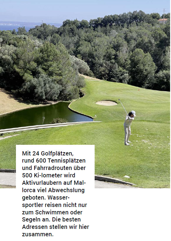 Mit 24 Golfplätzen, rund 600 Tennisplätzen und Fahrradrouten über 500 Kilometer wird Aktivurlaubern auf Mallorca viel Abwechslung geboten. Wassersportler reisen nicht nur zum Schwimmen oder Segeln an. Die besten Adressen stellen wir hier zusammen.