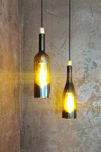 Die Affinität für Wein zeigt sich selbstverständlich auch in der Lobby: die Rezeptionstheke besteht aus einem riesigen Klausenit-Findling, die Lampen sind aus Weinflaschen und Reben. Und, damit es auch ja niemand übersieht, befinden sich hier gleich zwei begehbare Weinkühlschränke samt Verkostungsraum.